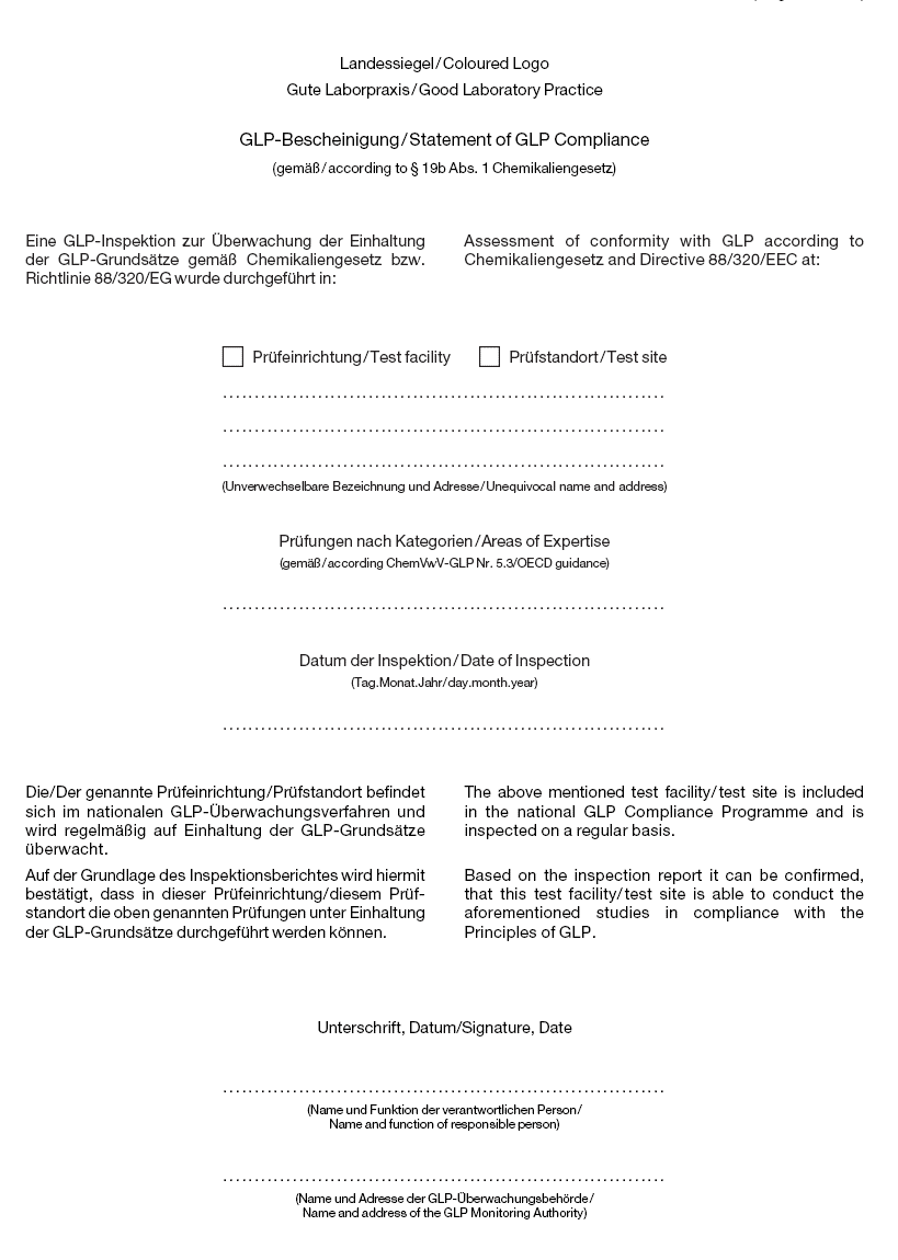 (3) Der Abschlussbericht muss vom Prüfleiter datiert unterschrieben werden, um die Übernahme der Verantwortung für die Zuverlässigkeit der Daten zu dokumentieren. Des Weiteren ist anzugeben, inwieweit die Prüfung mit diesen Grundsätzen der Guten Laborpraxis übereinstimmt.